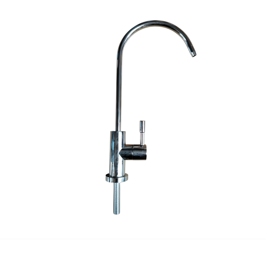 A silver faucet tap that comes with its fittings, ready to install on the kitchen sink. Sometimes it comes with a gold design as well.
